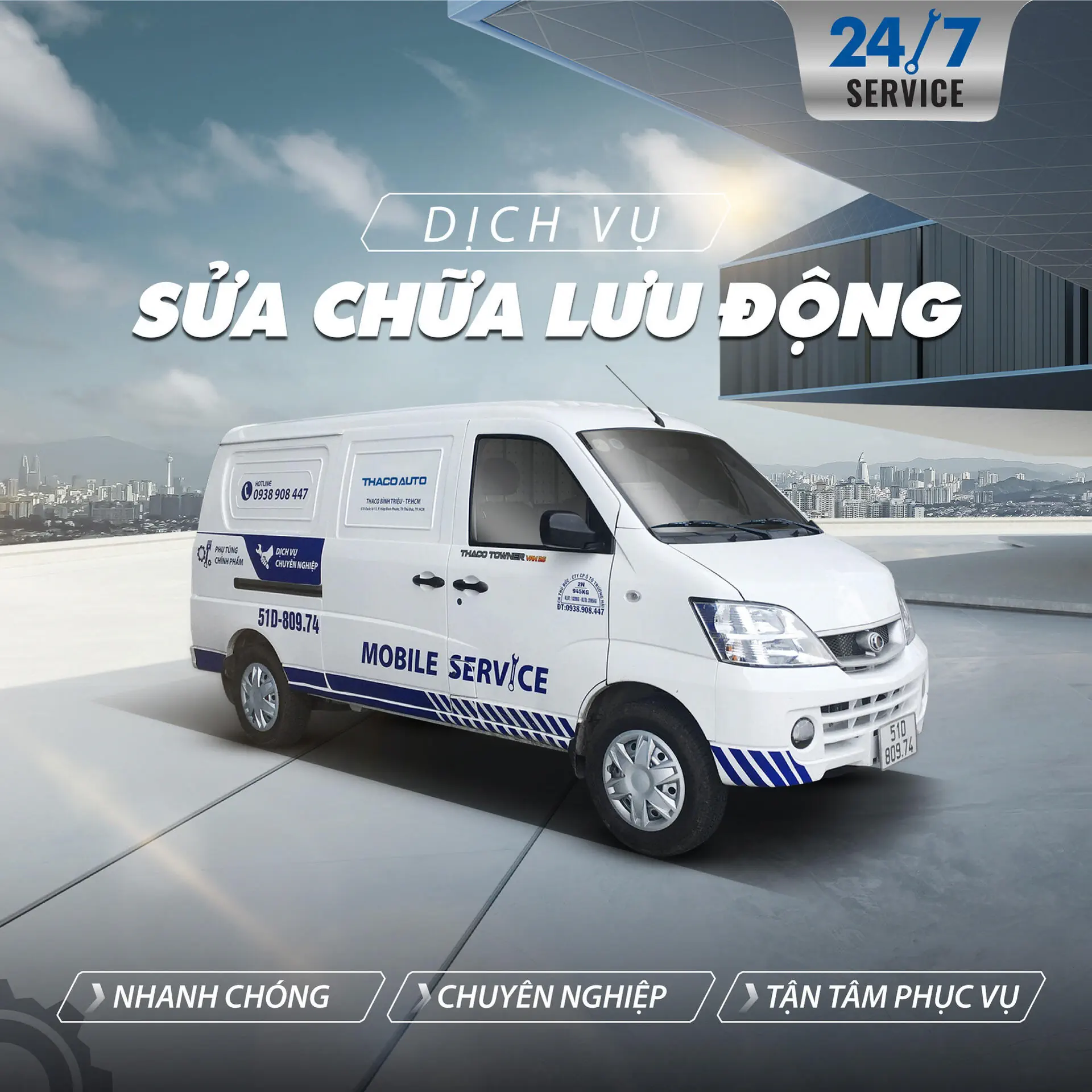 Với tiêu chí “Nhanh chóng - Chuyên nghiệp - Tận tâm phục vụ”, dịch vụ sửa chữa lưu động 24/7 của THACO AUTO Tiền Giang hỗ trợ Quý Khách hàng mọi lúc mọi nơi với các gói dịch vụ: bảo hành, bảo dưỡng định kỳ, sửa chữa, thay thế phụ tùng chính hãng và tư vấn kỹ thuật 24/7.