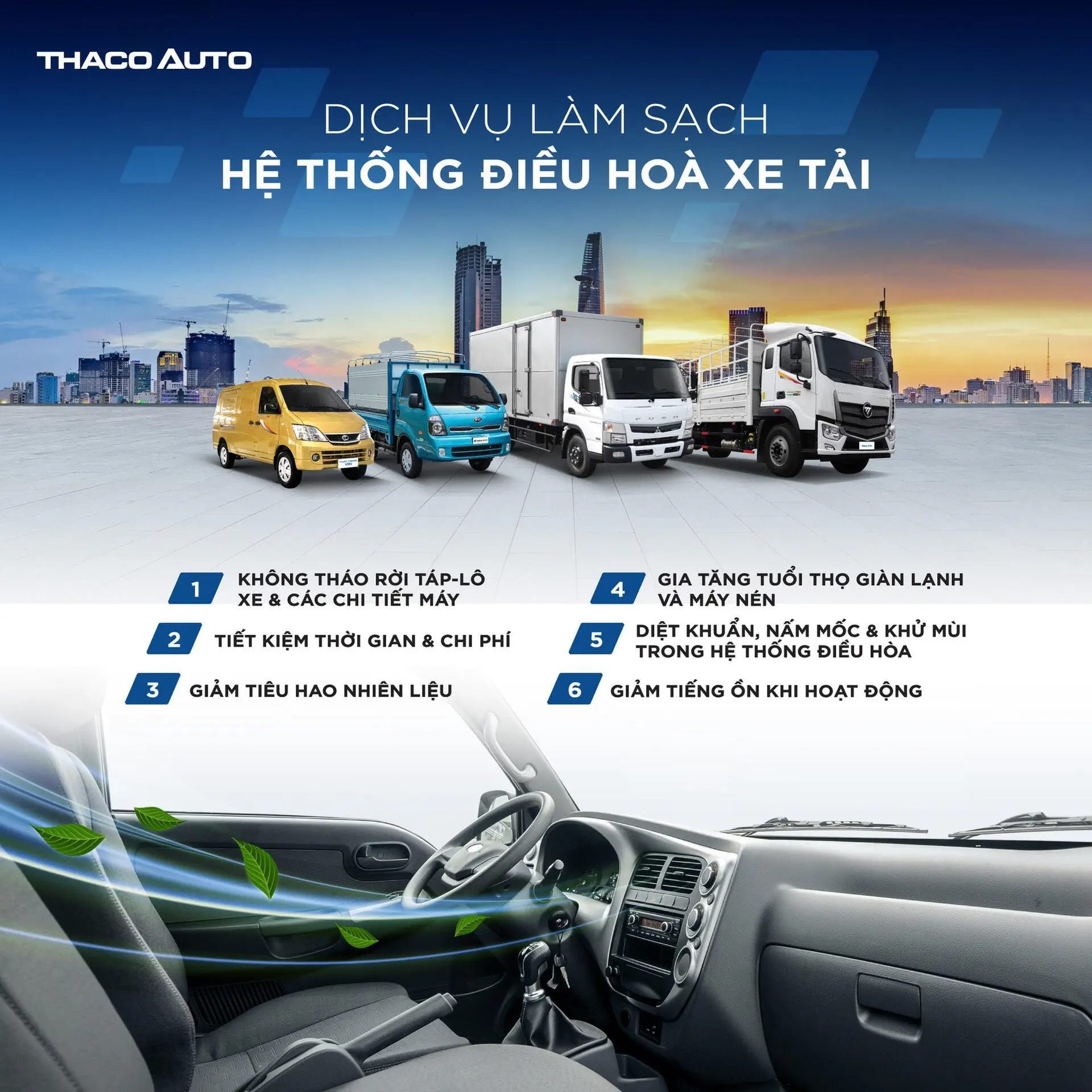 Nhằm gia tăng tuổi thọ hệ thống điều hoà, tiết kiệm chi phí bảo dưỡng xe và mang lại sự yên tâm, thoải mái cho Quý Khách hàng, THACO AUTO Tiền Giang cung cấp dịch vụ làm sạch hệ thống điều hòa xe tải bus với các ưu điểm nổi bật: